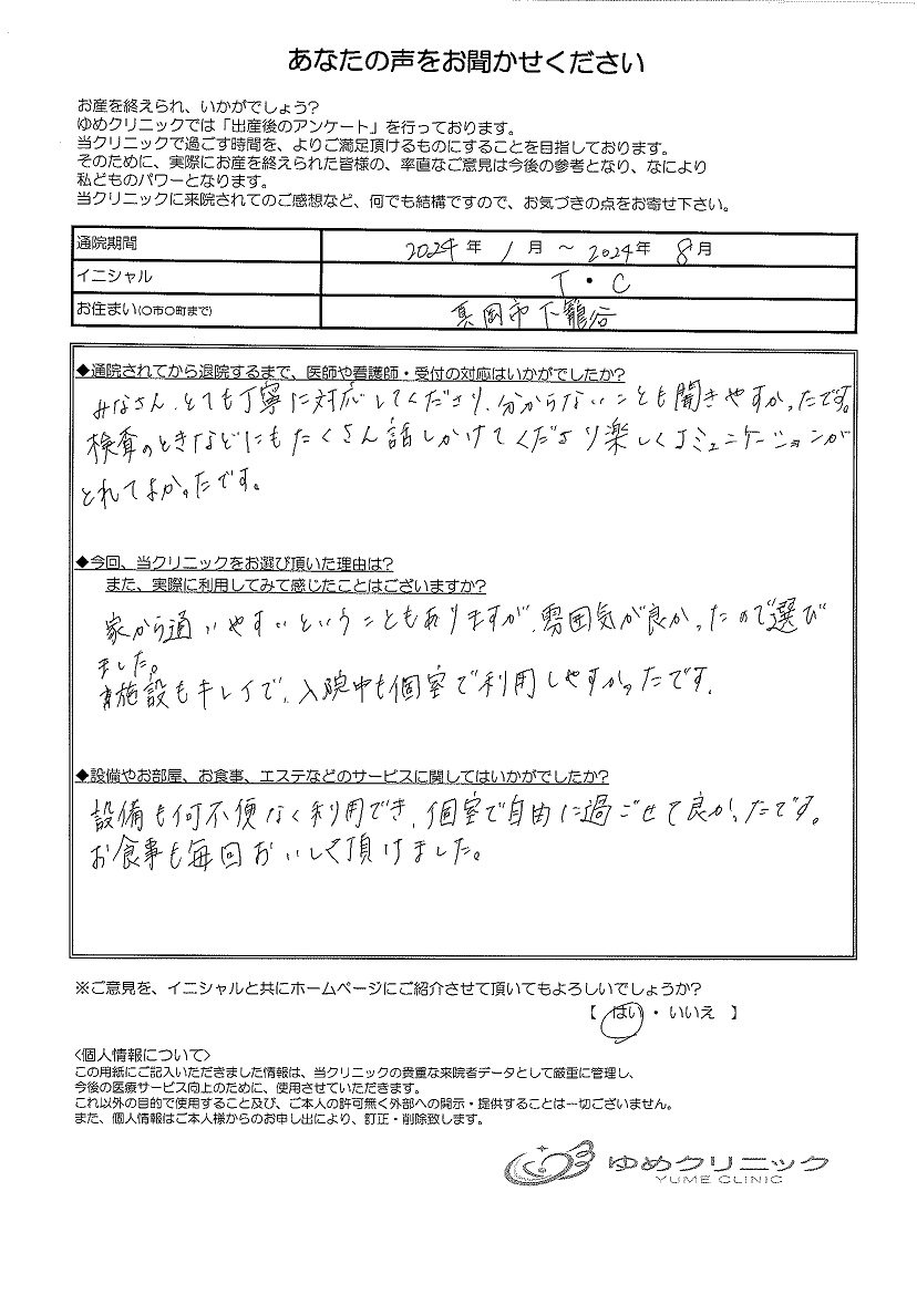 真岡市下籠谷 T・C様|妊婦健診 分娩 婦人科疾患 婦人科検診など、栃木県宇都宮市ゆいの杜の産婦人科ゆめクリニックにお越しください