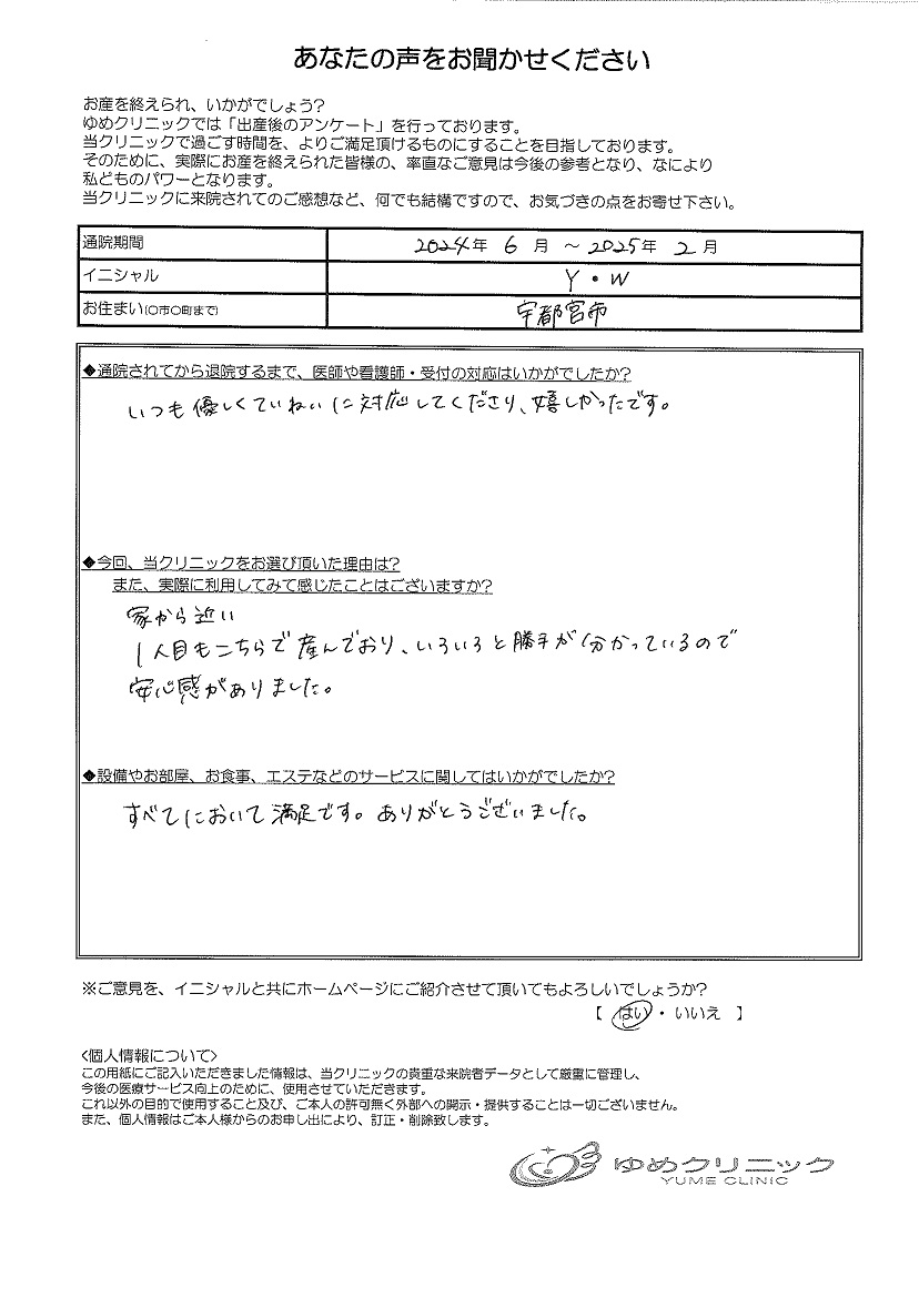 宇都宮市 Y・W様|妊婦健診 分娩 婦人科疾患 婦人科検診など、栃木県宇都宮市ゆいの杜の産婦人科ゆめクリニックにお越しください